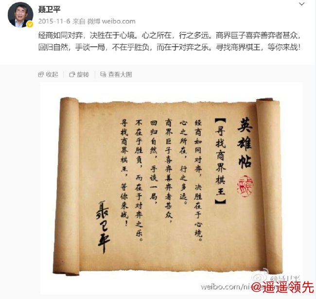 时光回溯至2015年11月,聂卫平在微博发布“商界棋王英雄帖”,一句“经商如同对弈,决胜在于心境。心之所在,行之多远”,正式拉开了商界棋王赛事的序幕。
