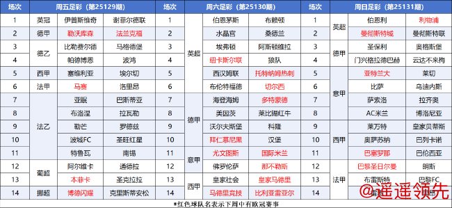 此外,本期国家队比赛后国脚众多的豪门球队受伤病影响较大,而包括曼城、切尔西、马竞、热刺即将面临艰难的魔鬼赛程,下周中即将欧冠联赛阶段首轮比拼,上述4队皆入选了周末和下周足彩,其中皇家社会vs皇马(周六)、曼城主战曼联(周日),这两场比赛需要特别留意具体球队重要球员的伤病状况。
